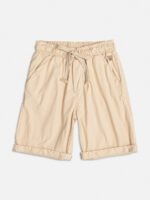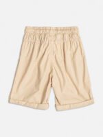 Confeccionada em sarja bege com elástico no cós e cadarço ajustável.