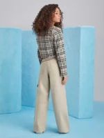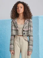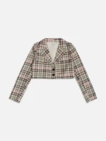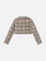 O blazer cropped em algodão é versátil e estiloso, perfeito para elevar o visual das garotas. Com fechamento de dois botões, gola blazer, mangas longas e uma estampa xadrez encantadora, é uma escolha cheia de charme. Além disso, detalhes como a placa de metal nas costas adicionam um toque especial. Ideal para criar looks elegantes e modernos. COmposição: 100% algodão. Ref: R4154