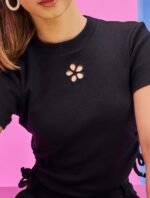 Blusa cropped em ribana, adicionando um toque de estilo ao seu guarda-roupa. O bordado vazado no peito confere charme sofisticado, enquanto a canaleta nas laterais permite inserir friso e criar laços, oferecendo opções de personalização. A plaquinha decorativa próxima da bainha acrescenta um toque final de elegância, disponível nas cores rosa ou preta. Composição: 49% algodão, 48% poliéster, 3% elastano. Ref: 15334