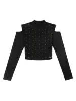 Essa blusa com manga longa preta, abertura nos ombros e detalhes em strass na frente é uma escolha elegante e sofisticada. É perfeita para diversas ocasiões, adicionando um toque de glamour ao seu visual. Composição: 96% ALGODÃO 4% ELASTANO. Ref: 15314