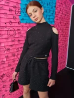 O short saia preto, é a escolha ideal para as garotas que desejam brilhar nas festas. Adornada com strass por