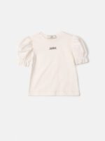 A blusa off white é uma peça de cotton que combina versatilidade e elegância. Suas mangas bufante, adicionam um toque de brilho sutil. A plaquinha decorativa na parte da frente da peça acrescenta charme extra. É perfeita para composições. Composição: 96% algodão e 4% elastano. Ref.: N3809