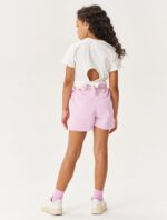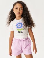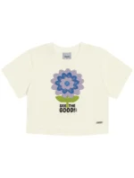 Blusa em meia malha com estampa em relevo divertida na parte frontal e plaquinha decorativa acima da barra. Nas costas, apresenta uma abertura com laço para amarrar, trazendo um ajuste delicado e charmoso. Composição: 100% algodão. Ref: 14887