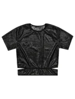 Blusa cropped preta em malha glow super estilosa! O brilho adiciona um toque de glamour, e a abertura lateral dar um charme extra. O elástico na gola e na cintura proporcionar um ajuste confortável e favorecedor. É uma escolha versátil que pode ser combinada com várias peças, desde jeans até saias mais elaboradas, dependendo da ocasião. Composição: 100% POLIÉSTER. Ref: 15293.