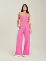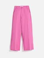 A calça rosa é confeccionada em tecido de alfaiataria, proporcionando um caimento sofisticado.