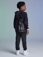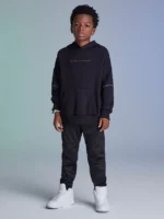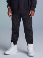 A calça preta é uma peça que combina estilo, conforto e atitude. Feita com o inovador tecido chimpa, esta calça representa a conexão perfeita entre moda e diversão. Na frente, detalhes cuidadosamente desenhados com recortes nos joelhos proporcionam um visual moderno alinhado com as últimas tendências. O cós elástico, junto com o cadarço personalizado, garante um ajuste perfeito para os pequenos, oferecendo conforto em todas as brincadeiras. Destaque para a etiqueta decorativa na perna esquerda, um detalhe especial que completa o look com personalidade. Composição: 100% Poliéster. Ref.: D2167