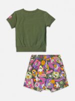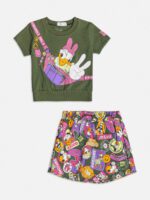 Este conjunto é uma combinação encantadora de charme e moda! A blusa e o shorts, ambos na cor verde militar, apresentam a adorável estampa da personagem Daisy, da Disney, adicionando um toque delicado e divertido aos looks das meninas. Além disso, a saia inclui uma estampa de bottons dos personagens Daisy, Pateta e o Pato Donald, proporcionando ainda mais charme e personalidade ao conjunto. Feito com materiais de alta qualidade, o conjunto oferece conforto e estilo, sendo a escolha perfeita para os dias de diversão. Composição: 100% algodão. Ref:H5240