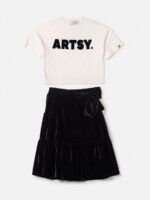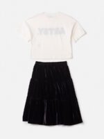 Encante-se com esse conjunto infantil, uma escolha cheia de charme para as pequenas fashionistas! A blusa em meia malha exibe uma estampa encantadora na frente, enquanto a saia de veludo adiciona um toque de sofisticação, com forro para garantir conforto durante todo o dia. O elástico no cós proporciona um ajuste perfeito, enquanto os babados conferem um toque especial à peça. Composição: Blusa – 100% algodão. Saia – 95% poliéster e 5% elastano. Ref.: N3997