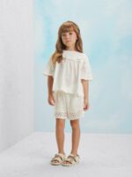 O short possui um elástico no cós para um ajuste perfeito no corpo das meninas, enquanto o forro de malha na parte de baixo garante discrição.