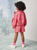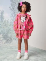Conjunto pink com jaqueta bomber de gola alta, zíper frontal e elástico nos punhos e barra. O short tem elástico na cintura e modelagem básica. Ambas as peças têm estampa pied de poule. Composição: 100% algodão. Ref.: N4011.