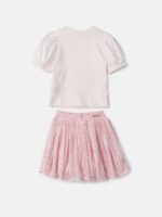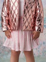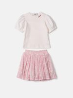 O conjunto infantil é puro charme para as pequenas fashionistas! A blusa canelada com mangas bufantes adiciona um toque moderno, enquanto a saia de tule com paetê oferece um brilho sofisticado, elevando o visual das meninas. Perfeito para criar um look glamouroso, ideal para ocasiões especiais. Composição – Blusa: 49% poliéster, 47% algodão e 4% elastano. Saia: 97% poliéster e 3% elastano. Ref.: P5645