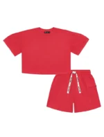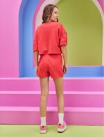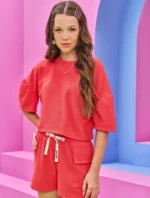 Este conjunto em rosa cheer traz uma blusa leve e delicada com decote arredondado ou em V, combinada com um shorts de corte confortável e casual. A cor vibrante cria um visual alegre e moderno, perfeito para ocasiões descontraídas e dias ensolarados. Composição: BLUSA: 50% ALGODÃO 50% POLIÉSTER SHORTS: 50% ALGODÃO 50% POLIÉSTER. Ref: 15421