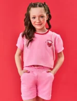 Esse conjunto é simplesmente irresistível para as pequenas fashionistas! A blusa em moletom traz uma adorável estampa no peito com um cheirinho de morango, perfeita para transmitir alegria. Os detalhes franzidos nos ombros dão um toque de estilo e sofisticação, deixando a peça ainda mais charmosa.