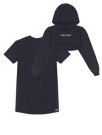 Conjunto de blusão e vestido ribana preto, oferece conforto e estilo. Feitos de um tecido elástico e macio, ambos se ajustam ao corpo. O blusão tem mangas compridas, tende a ser justo. Juntos, proporcionam uma aparência coordenada e moderna para ocasiões casuais. Composição: 100% algodão. Ref.:15311