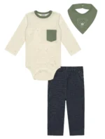Conjunto completo para bebês, incluindo um body confortável, uma calça combinando e um babador prático. Composição: BODY: 98% ALGODÃO 2%POLIÉSTER CALÇA: 69%ALGODÃO 26%POLIÉSTER 5%ELASTANO/BABADOR:100% ALGODÃO. Ref:16095