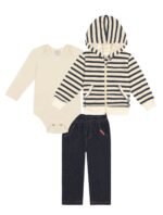 conjunto bebê masculino de body básico no tom de azul em cotton com gola transpassada para melhor vestir e abertura em botões colete em pelo carneirinho com abertura em zíper com proteção detalhe de orelhas 3D no capuz e etiqueta decorativa no peito calça em suedine linho com elástico no cós e estampa total. Body: 96% algodão, 4% ELASTANO CALÇA: 67% ALGODÃO 28% POLIÉSTER 5% LINHO/COLETE:100% POLIÉSTER. Ref: 16092