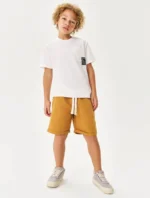 Esse conjunto une conforto e estilo com perfeição. A camiseta de malha eros destaca-se pelo bolso no peito com etiqueta decorativa, adicionando um toque moderno. A bermuda em sarja empapelada oferece ajuste ideal com elástico e cadarço no cós, além de bolsos frontais funcionais e detalhe de braguilha fake. Ideal para os pequenos que valorizam praticidade, charme e modernidade. Composição: camiseta: 74% poliéster 26% algodão, bermuda: 100% algodão. Ref:19191