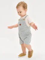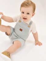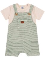 Conjunto composto por camiseta em meia malha, com abertura no ombro em botões para facilitar o vestir, e jardineira em moletom listrado. A jardineira tem alças reguláveis com botões e bolso frontal com etiqueta decorativa. Composição: blusa 67% algodão 28% poliéster 5%linho, jardinheira 79% algodão 21% poliester. Ref: 16112