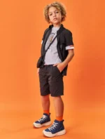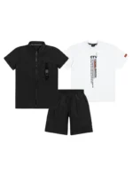 Esse conjunto é ideal para as crianças que adoram se movimentar com estilo e conforto. A camisa de nylon com zíper frontal traz praticidade e um ajuste firme, perfeita para um dia cheio de aventuras. O detalhe do bolso com fecho no peito oferece segurança para carregar pequenos itens importantes, como chaves ou moedas. A camiseta de meia malha com estampa vibrante no peito complementa o look, adicionando um toque de diversão e personalidade, garantindo que o conjunto seja versátil e atraente para diferentes ocasiões. Composição: camiseta 100% algodão, bermuda 100% poliamida, camiseta 100% poliamida. Ref: 19122