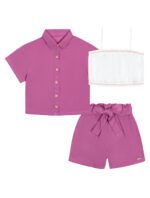 O conjunto camisete, shorts e top lilás Melissa é fresco e moderno. A camisete tem um design leve e solto, o shorts é confortável e bem ajustado, e o top adiciona um toque de delicadeza ao visual. Todos em um tom lilás suave, o conjunto é ideal para um look casual e elegante. Camisete: 95% viscose, 5% linho. Shorts: 95% viscose, 5% linho. Top: 100% algodão. Ref: 14982