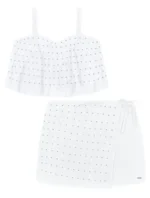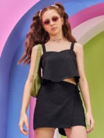 Este conjunto moderno é composto por um top ajustado, combinando com um shorts ou saia de corte confortável e casual. Ideal para dias quentes, oferece um visual leve e estiloso, perfeito para ocasiões informais. Composição: 100%algodão. Ref: 15414