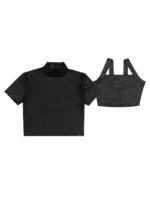 Este conjunto é composto por um top preto básico e uma sobreposição complementar, que pode ser uma camisa leve, colete ou cardigã. O top oferece um ajuste simples e elegante, enquanto a sobreposição adiciona um toque de sofisticação e versatilidade ao visual, ideal para várias ocasiões. Composição: