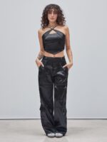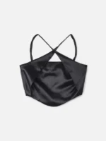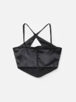 O cropped acetinado é uma peça fashion com um visual moderno e sofisticado. Com recortes frontais, alças transpassadas e barra que remete aos corsets, ele traz elegância e estilo. O zíper em metal preto nas costas completa o design uniforme, tornando-o uma escolha versátil para compor diversos looks. Composição: 100% poliéster. Ref.: T9432