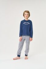 Este conjunto de pijama é perfeito para garantir conforto e aquecimento durante as noites mais frias. Com uma combinação elegante de azul marinho, proporciona um visual clássico e relaxante para o seu menino. Composição: 70% algodão e 30% poliéster. Ref:17732