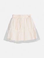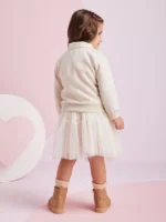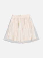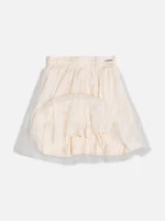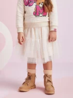 A saia off white é uma peça encantadora que adiciona um toque meigo aos looks das meninas. Feita de tule com forro, proporciona conforto e elegância. O elástico no cós garante um ajuste perfeito, enquanto o detalhe da plaquinha de metal adiciona um toque especial à peça. Ideal para compor visuais delicados e charmosos, esta saia é perfeita para que as pequenas se destaquem com estilo. Composição: 100% poliéster. Ref.: H4925.