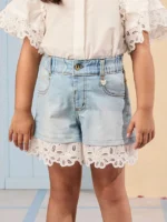 Esse short jeans com acabamento em bordado inglês é a definição de charme e casualidade! O detalhe delicado na barra traz um toque romântico ao visual, perfeito para quem adora peças diferenciadas. A cintura ajustável é um grande diferencial, proporcionando praticidade e um caimento ideal.