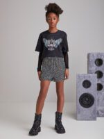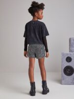 O short preto de paetê ,é uma peça desenvolvida em malha, oferecendo versatilidade e estilo para as garotas. Com sua aplicação de paetê e cós elástico, é uma escolha perfeita para adicionar um toque de brilho e glamour ao visual. Com este short, as meninas estarão prontas para arrasar em qualquer ocasião.