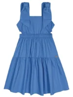 Vestido em tricoline com elastano, que combina conforto e estilo moderno. O detalhe de laço nos ombros adiciona um toque delicado e feminino, enquanto a abertura na cintura com elástico proporciona um ajuste perfeito e confortável, destacando a silhueta de maneira sutil. Uma plaquinha decorativa acima do recorte finaliza o look com um detalhe charmoso. Composição: 97% algodão 3% elastano. Ref: 14932