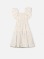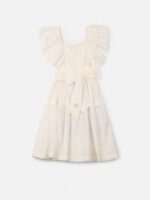 A combinação perfeita de delicadeza e elegância. Traz sofisticação com seus bordados vazados, enquanto os babados adicionam movimento e charme à peça. A cor pérola é clássica, suave e transmite uma sensação de leveza, tornando o vestido ideal para diversas ocasiões, desde um evento diurno até uma festa mais casual à noite. Composição 100% algodão. Ref: n4428