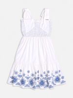 Este elegante vestido off white é ideal para ocasiões festivas, feito em tecido plano de alta qualidade, apresenta uma encantadora estampa de flores azuis na barra, que adiciona um toque de sofisticação.