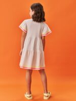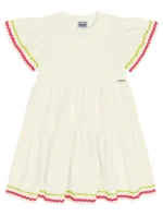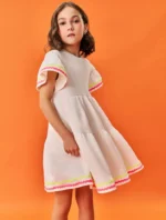 Com charme e conforto, o vestido em moletinho waffle é ideal para um look descontraído e estiloso. Ele apresenta mangas evasê com franzido para um efeito delicado e feminino, além de detalhes em neon nas mangas e na barra que adicionam um toque moderno e vibrante. Uma plaquinha decorativa acima do recorte na cintura proporciona um detalhe sofisticado e contemporâneo. Composição: 50% algodão e 50% poliéster. Ref: 14919