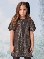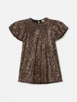 Este adorável vestido de festa da Animê vai deixar as meninas ainda mais estilosas, com um visual glamouroso perfeito para ocasiões especiais. Feito com paetês marrom, ele possui um forro de malha para garantir conforto ao vestir. Suas mangas evasê e decote nas costas com abertura de botão funcional são detalhes encantadores que agregam charme à peça. Combine-o com sapatilhas ou mocassins para um look charmoso e elegante. Composição: 97% poliéster e 3% elastano. Ref.: N3648