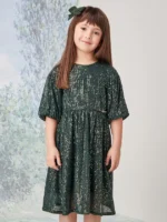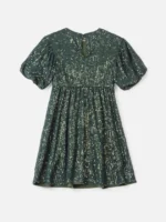 O vestido de gala é uma escolha elegante na tonalidade verde. Apresenta mangas curtas, forro de malha e um decote nas costas com um botão de pérola. O estilo distintivo da marca acrescenta um toque exclusivo a esta peça encantadora. Seja para ocasiões especiais, cerimônias de casamento ou celebrações, este vestido é a escolha ideal para jovens que procuram sofisticação e charme. Composição: 97% Poliéster, 3% Elastano. Ref.: N3641