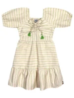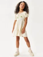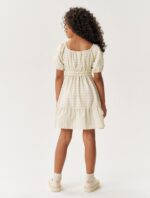 Vestido em tricoline sarjada fio tinto, que combina modernidade e conforto. Com mangas bufantes, oferece um visual romântico e feminino. O detalhe de amarração no peito adiciona charme e delicadeza, enquanto os recortes na cintura e na barra com franzidos proporcionam um caimento fluido e leve. Uma etiqueta clip próxima da bainha finaliza o visual com um toque charmoso. Composição: 80% algodão e 20% poliéster. Ref: 14931